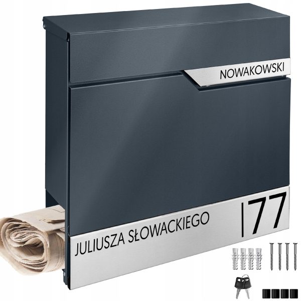 SKRZYNKA POCZTOWA NA LISTY + ADRES NAPIS NOWOCZESNA ANTRACYTOWA GAZETNIK