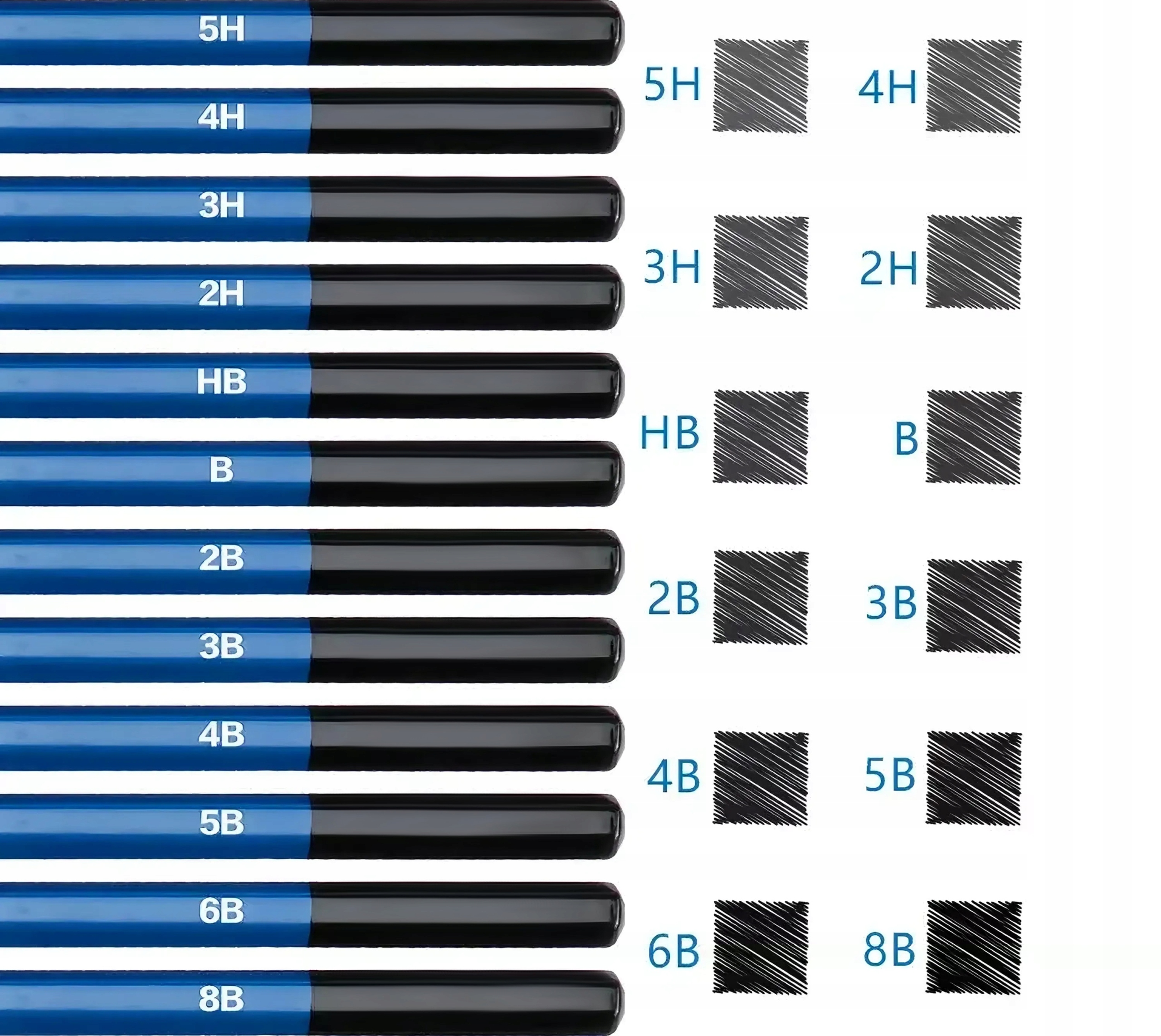 ✔️ W skład zestawu wchodzi 12 rodzajów ołówków. Ich twardość można poznać po symbolach 2H / 3H / 4H / 5H / HB / B / 2B / 3B / 4B / 5B / 6B / 8B.