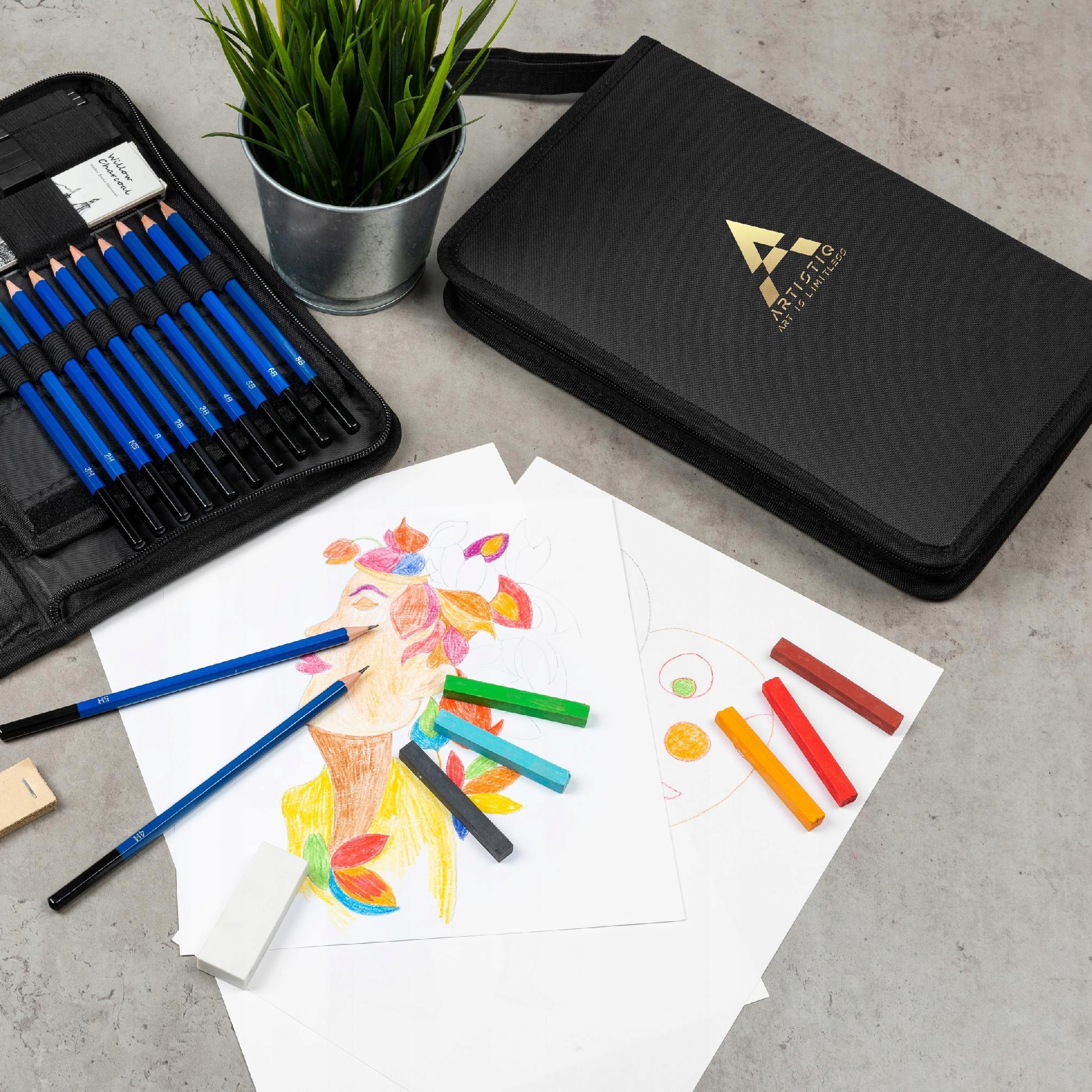 ✔️ Przydatne akcesoria takie jak gumka do ścierania, temperówka, nóż i stylowe etui pozwolą na komfortowe rysowanie w każdym miejscu.