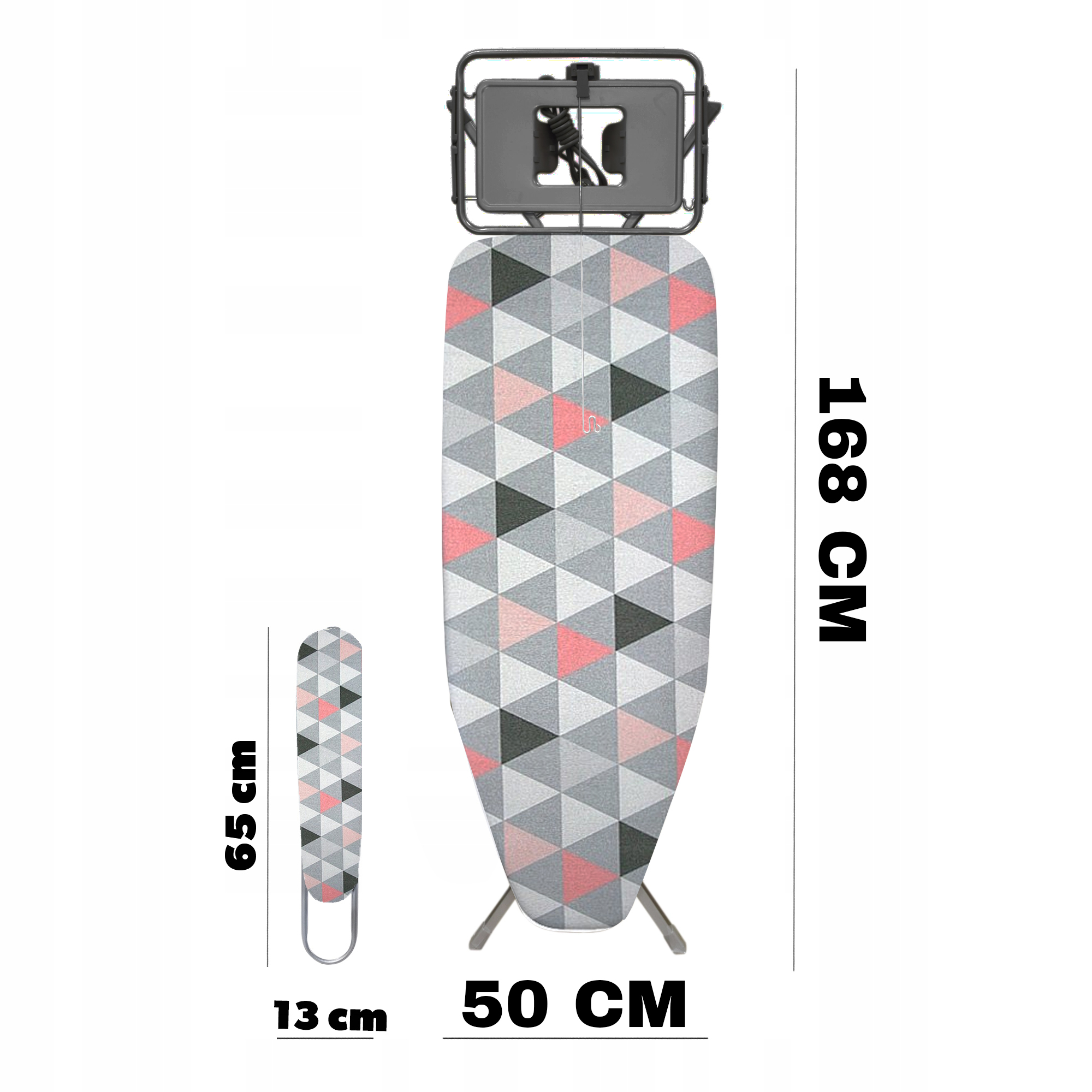 Wymiary blatu oraz możliwość złożenia deski (168 x 50 x 9 cm) sprawiają, że łatwo ją przechować, nie zajmując przy tym dużo miejsca. Dodatkowo, wzór pokrowca w stylu Triangles Pink nadaje desce niepowtarzalnego charakteru.
