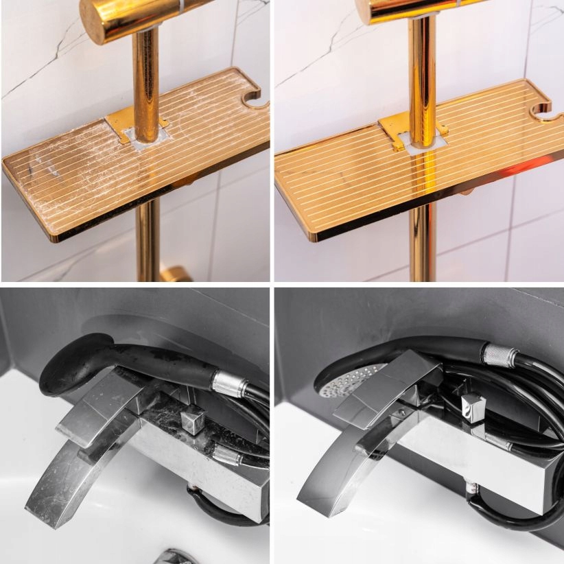 ☑️Przyjazny skład bez chloru, bezpieczny dla powierzchni chromowanych, złotej czy czarnej armatury oraz elementów z tworzyw sztucznych.