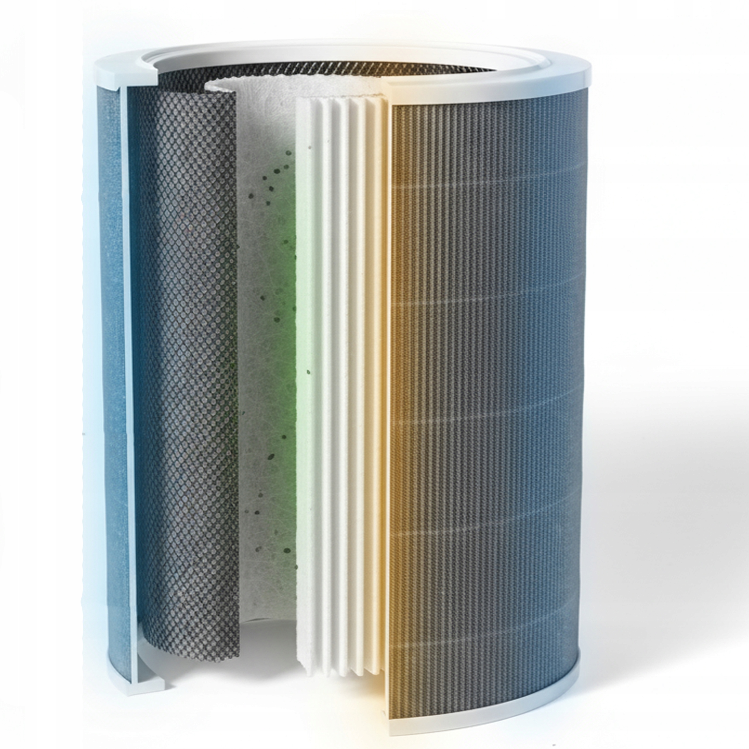 2️⃣ Filtr HEPA 13 (środkowy) – wychwytuje mikroskopijne cząsteczki PM2.5, pyły, aerozole i alergeny, usuwając do 99,97% drobin z powietrza.