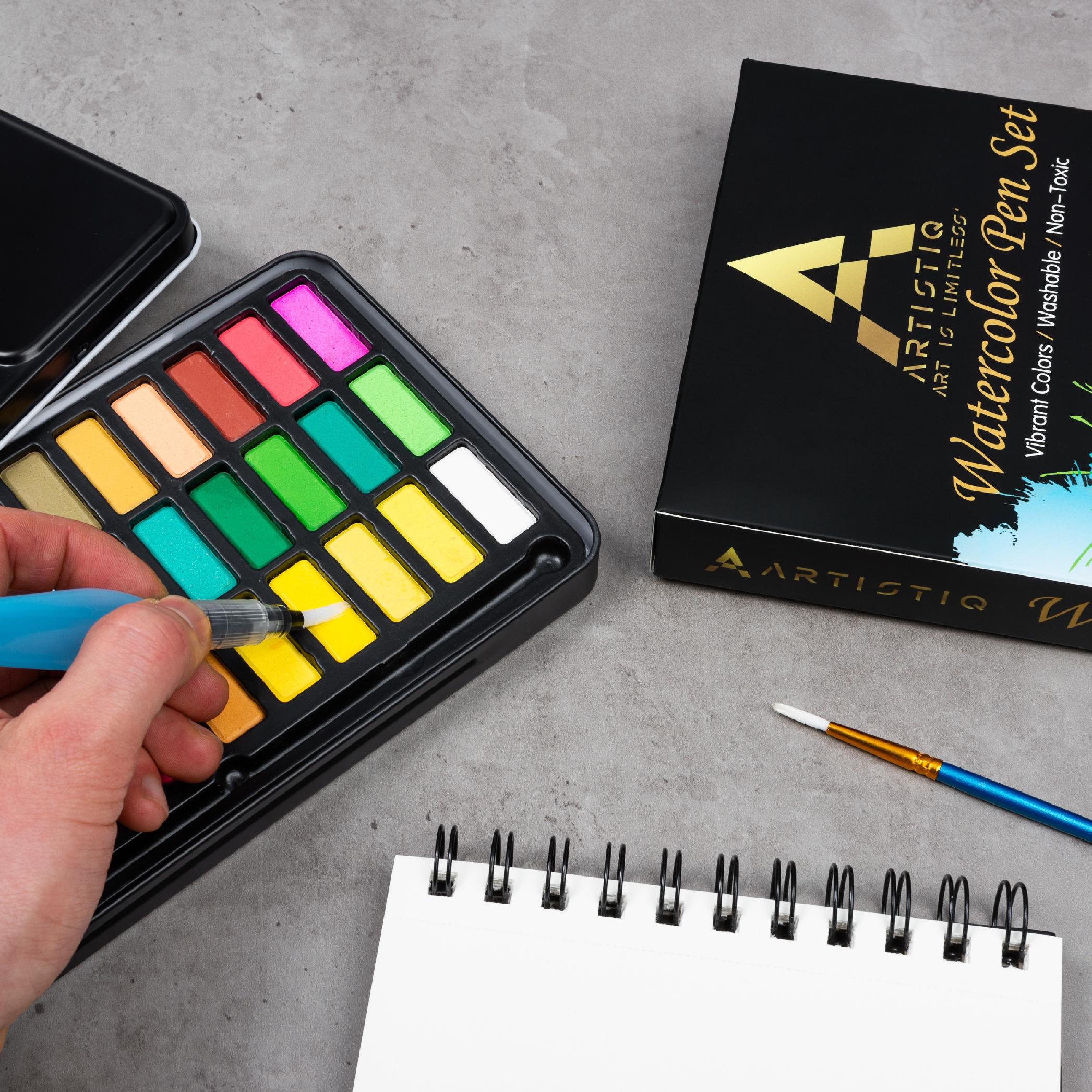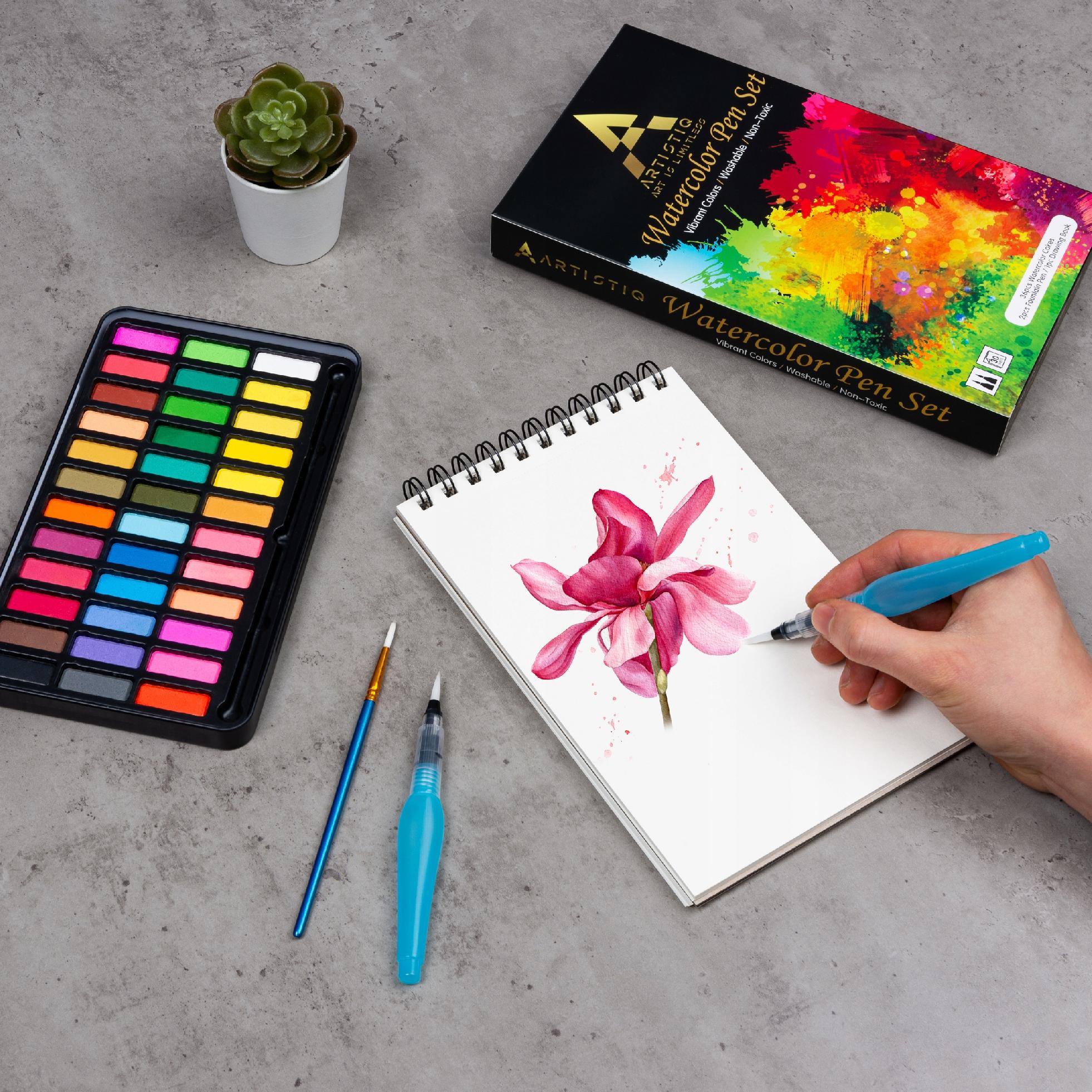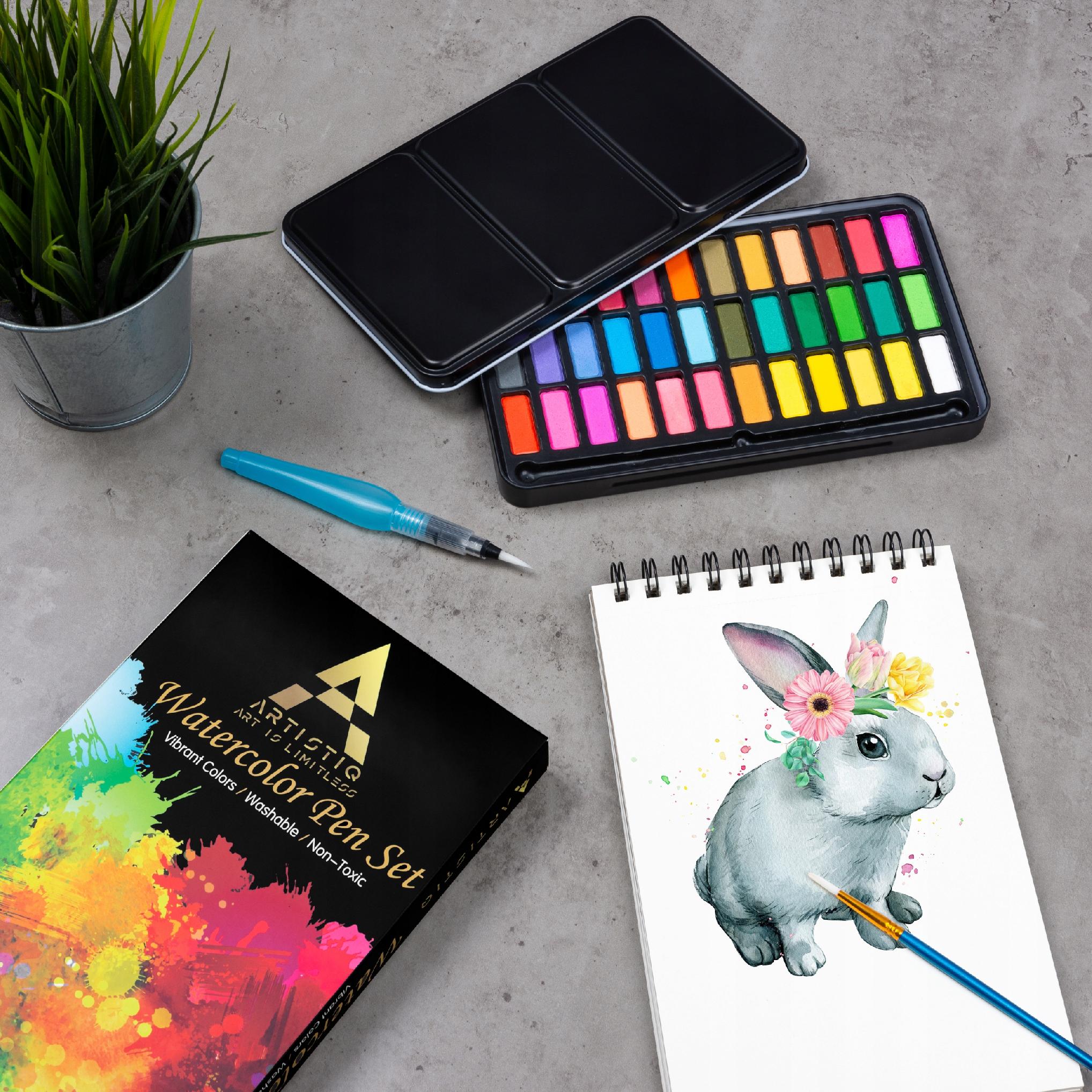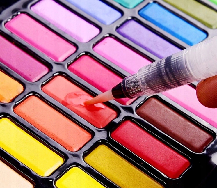 Farby akwarelowe w kostkach marki ARTISTIQ. W opakowaniu poza wygodną paletką z 36 kolorami farb znajdują się dwa profesjonalne pędzle automatyczne, klasyczny pędzelek oraz blok A5 dedykowany do malowania akwarelami. Farby charakteryzują się bardzo wysokim stężeniem pigmentów oraz bardzo gładką konsystencją.