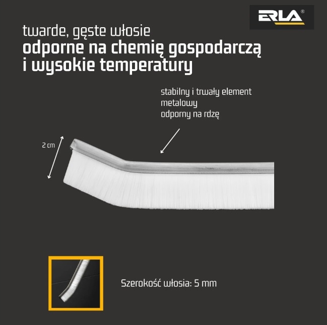 Posiada twarde nylonowe włosie, odporne na wysoką temperaturę i chemię gospodarczą.