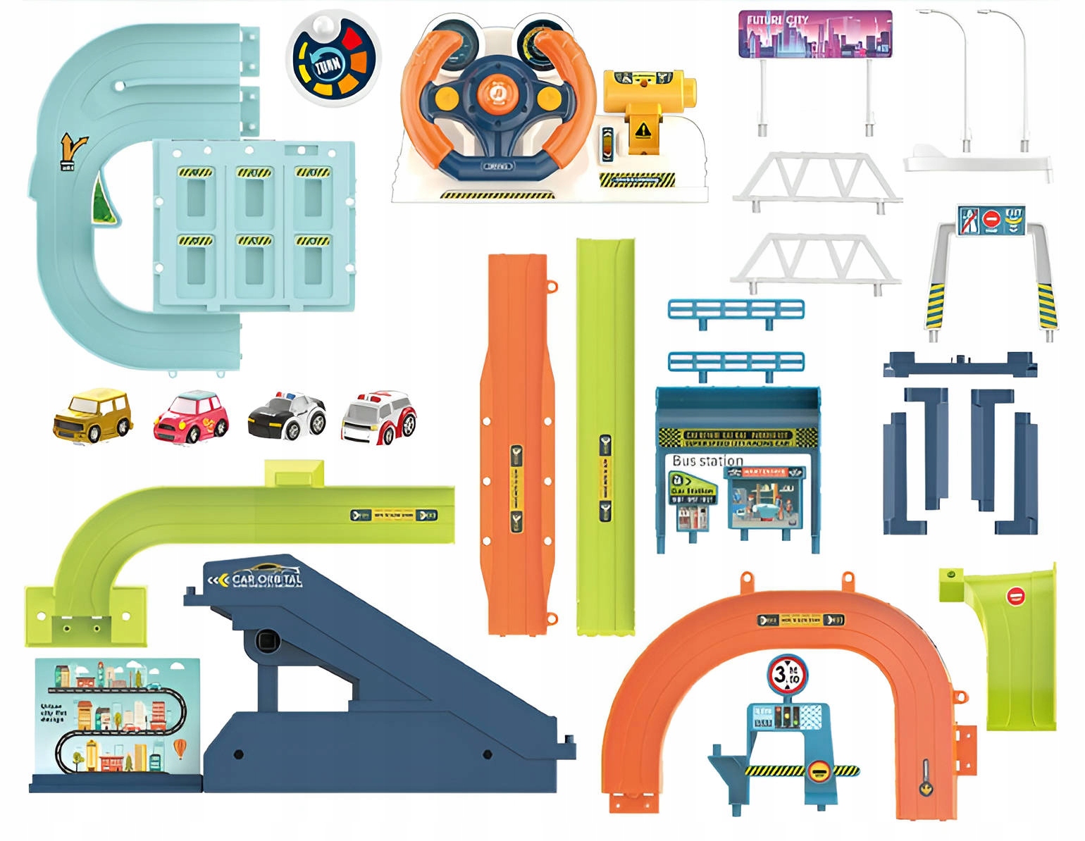 Parkingu posiada sześć miejsc parkingowych, które umożliwiają zaparkowanie dołączonych do zestawu samochodzików.