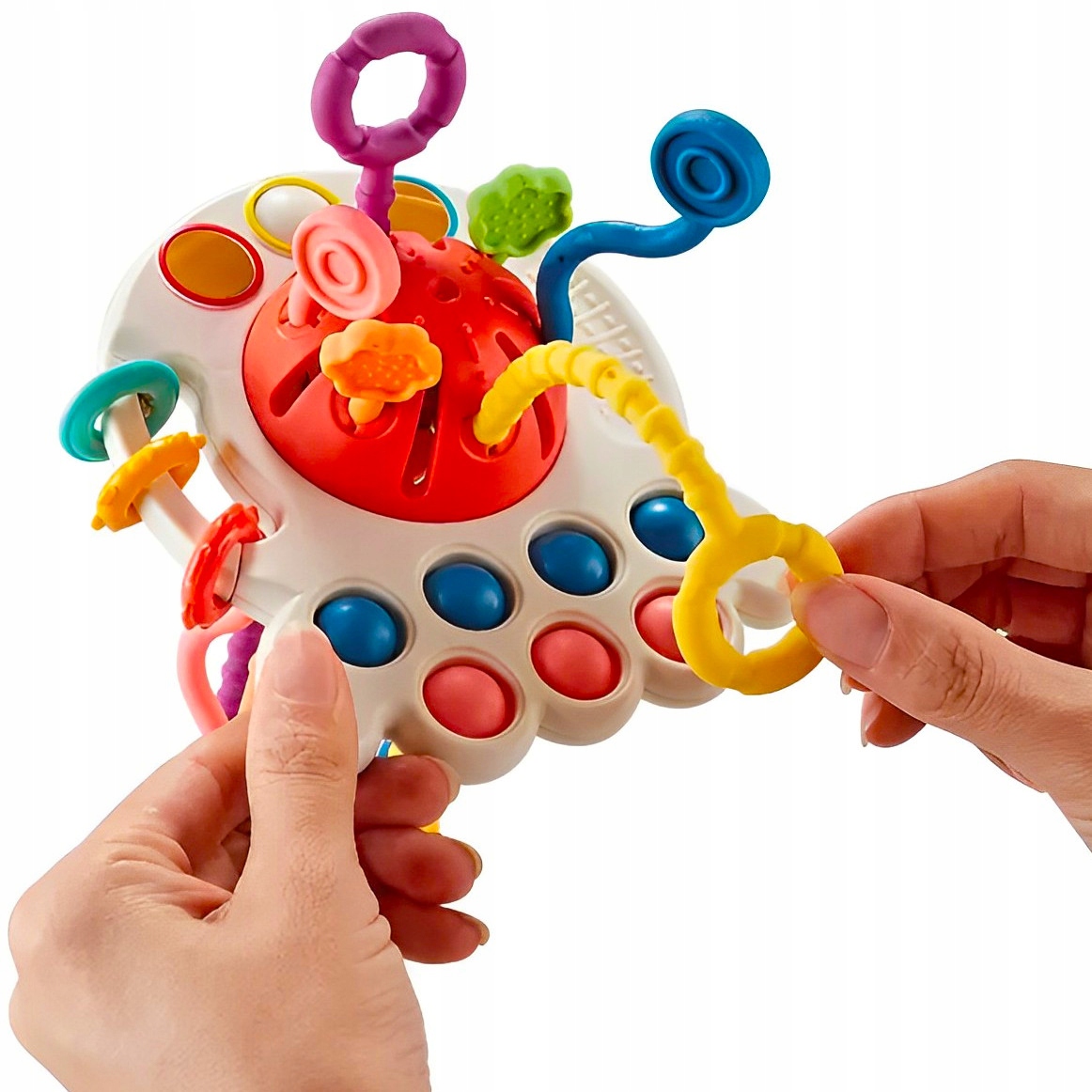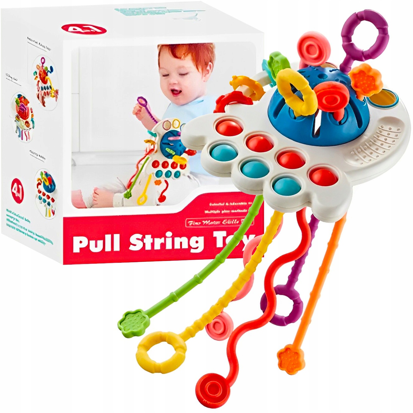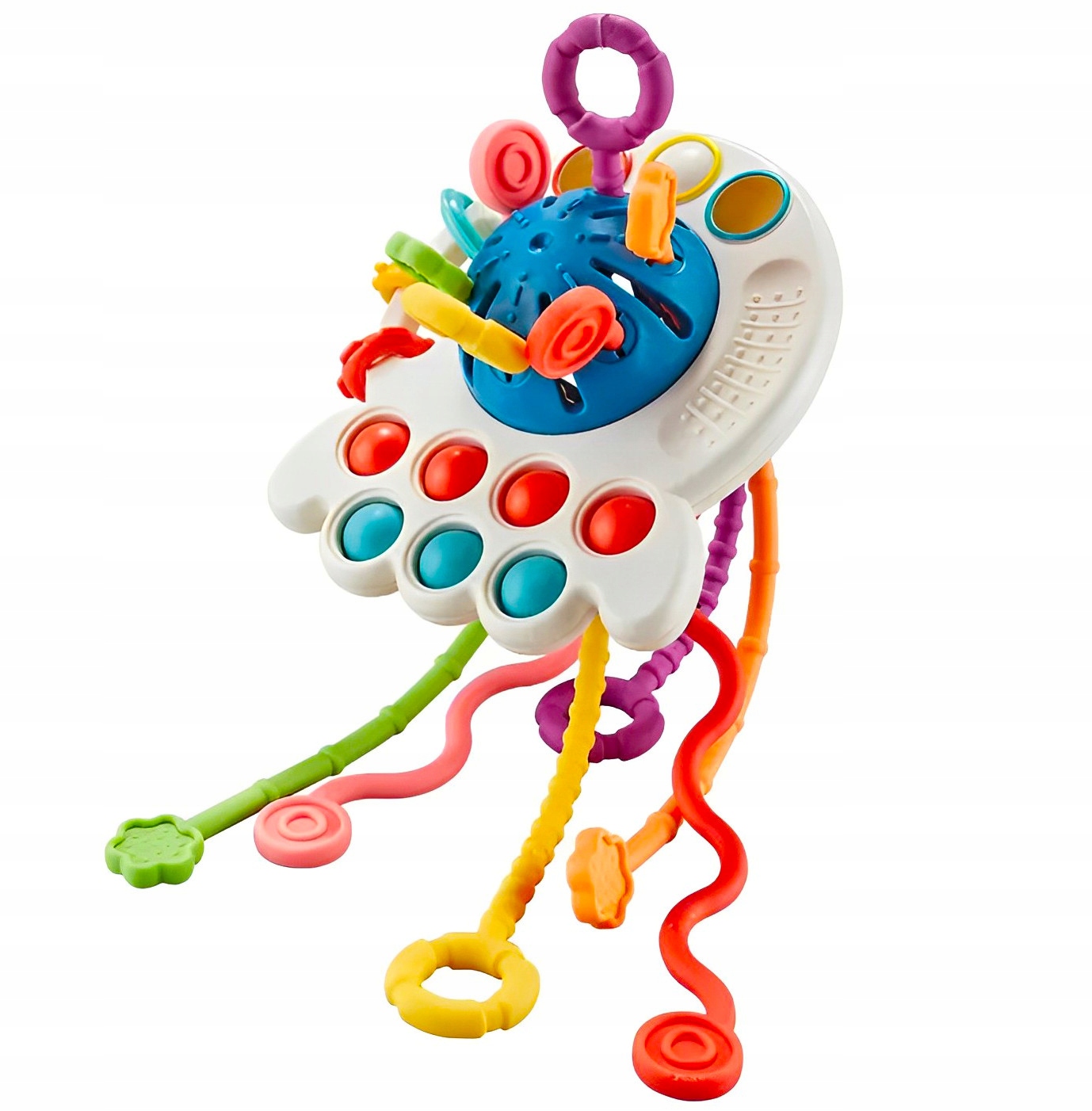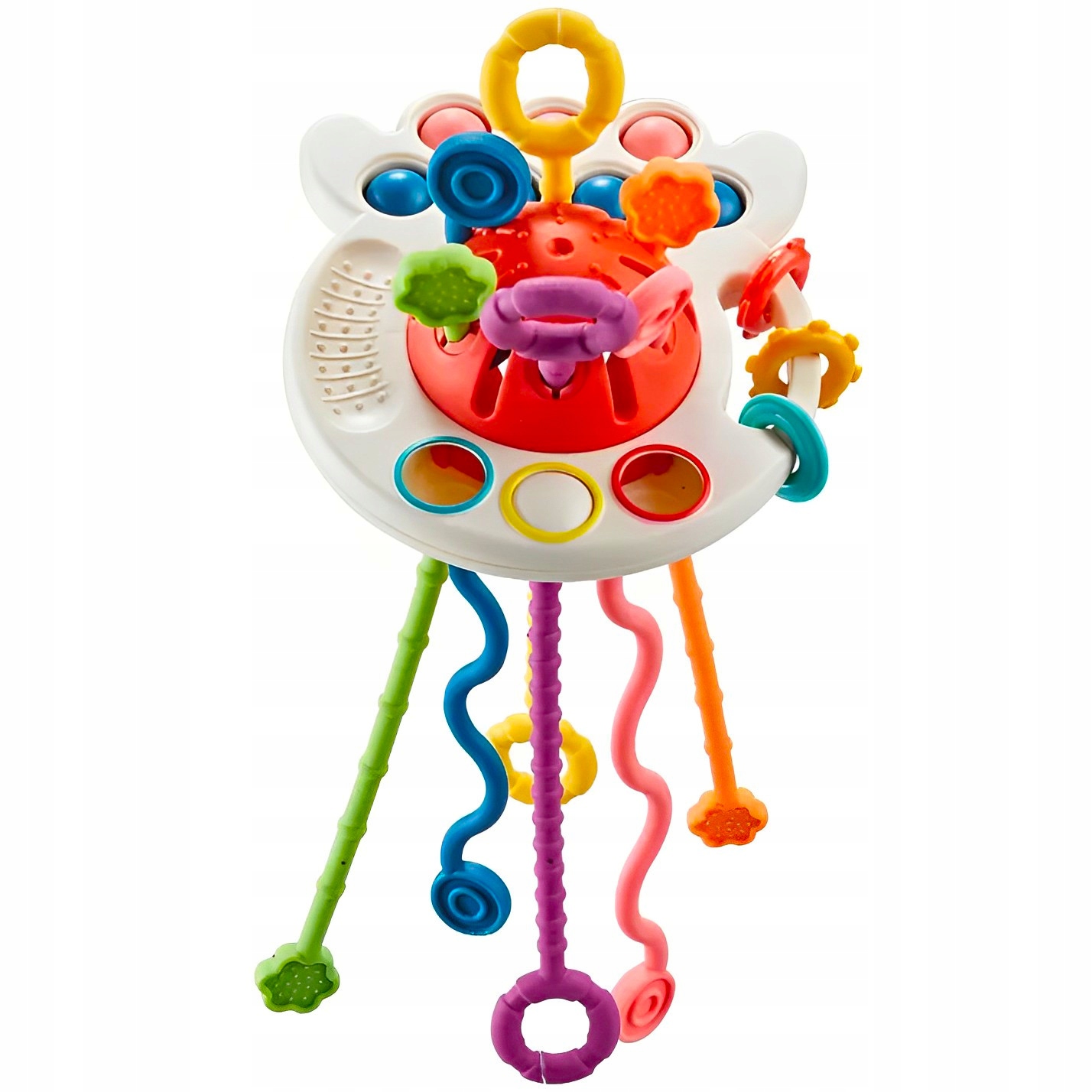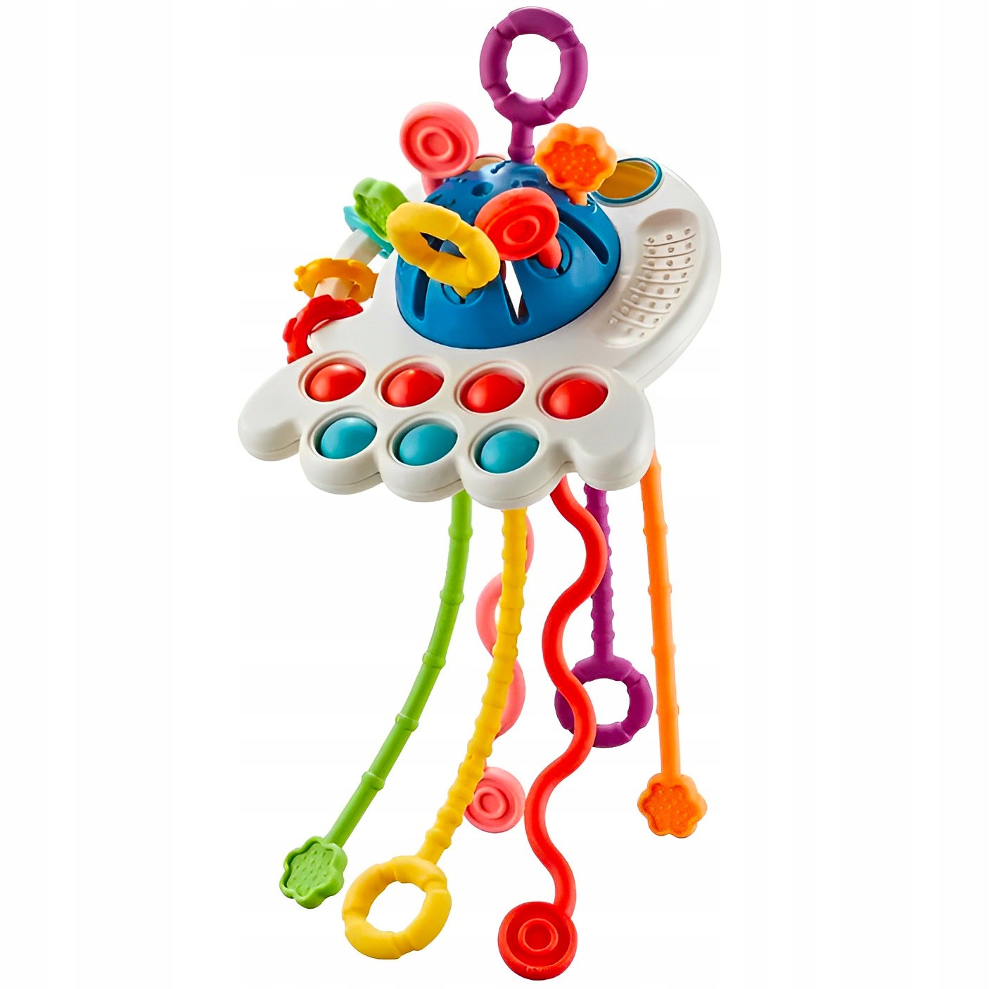 Wielokolorowa zabawka sensoryczna dla niemowląt. Zabawka posiada sześć różnokolorowych sznurków o różniej fakturze i kształcie, co zaciekawi małego odkrywcę i zachęci do zabawy, dodatkowo wydobywając różne dźwięki i wibracje przy ich przeciąganiu. Siedem wciskanych bąbelków oraz kółeczka o różniej fakturze i kolorze dodatkowo uatrakcyjnia zabawę.
