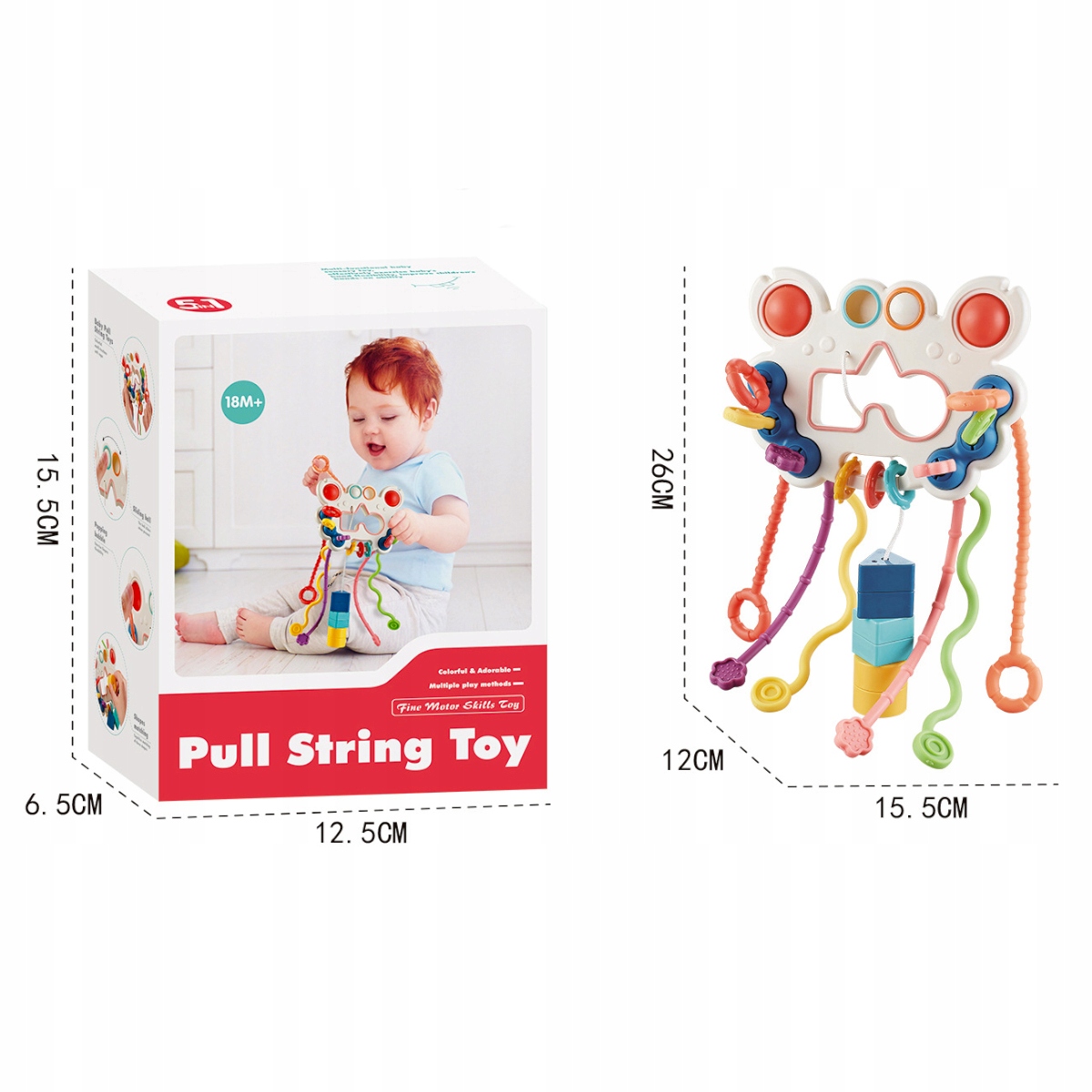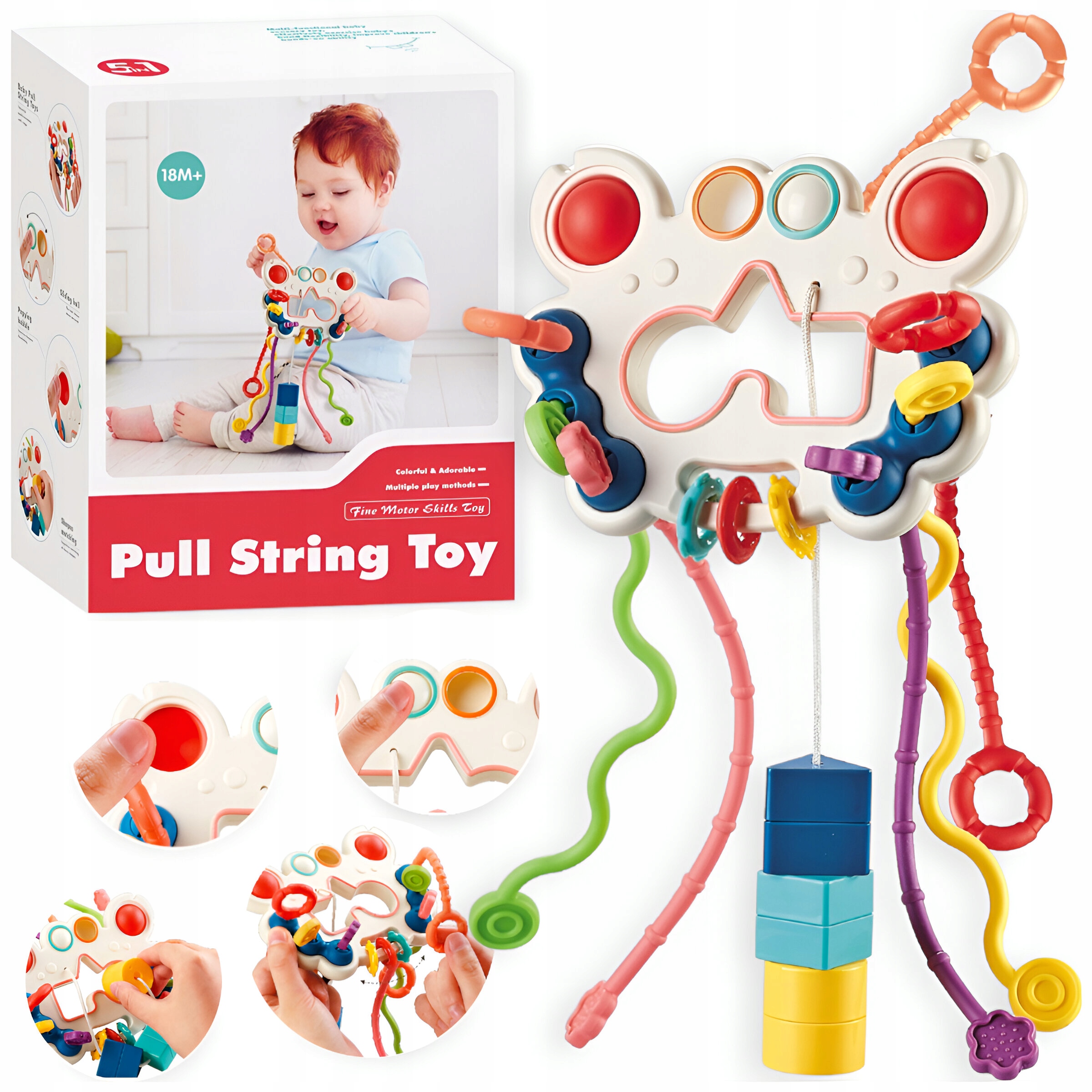 - 6 długich sznurków z możliwością ich przeciągania – różne końcówki, przystosowane do rąk niemowlęcia