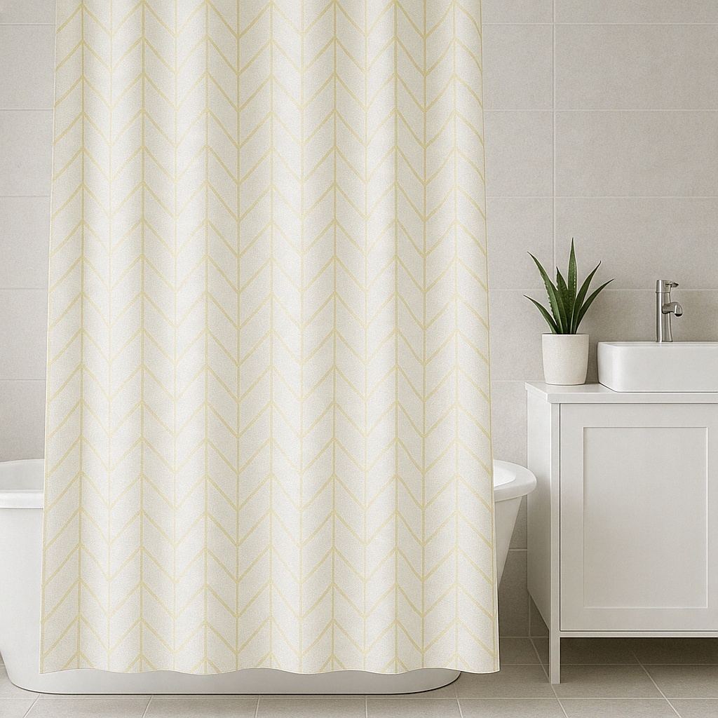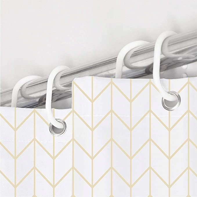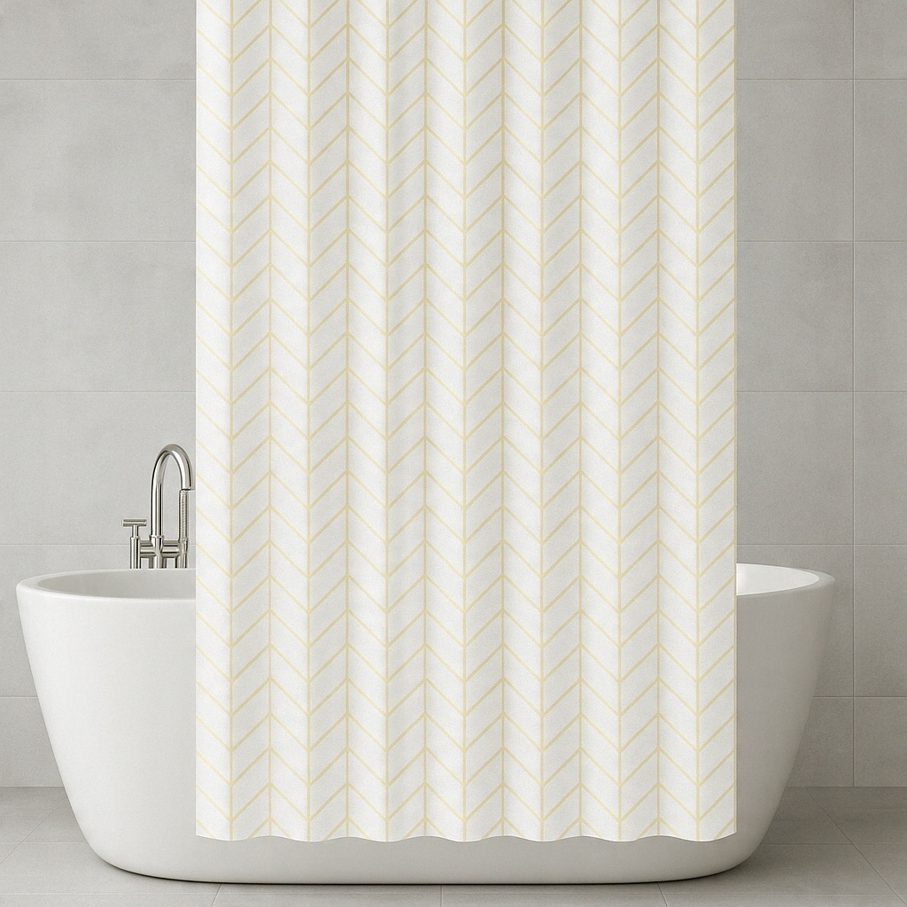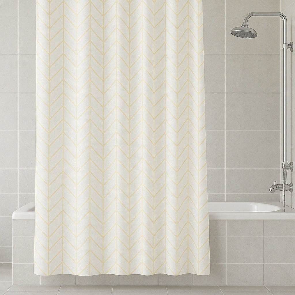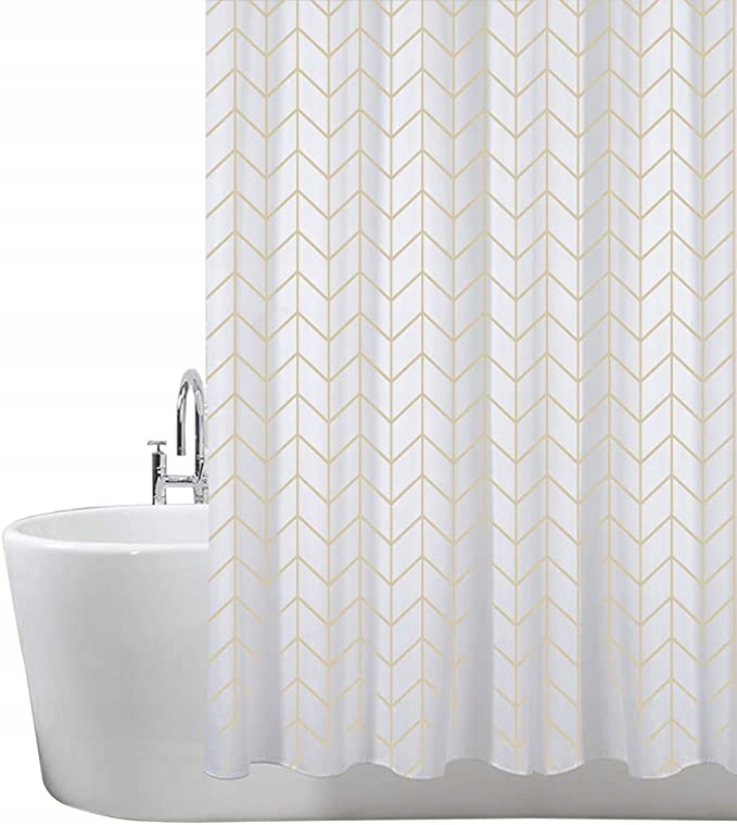 Wprowadź do swojej łazienki nutę nowoczesnej elegancji dzięki tej wyjątkowej zasłonie prysznicowej w subtelny wzór złotej jodełki. Jej delikatnie połyskujące linie na tle ciepłej bieli dodają wnętrzu lekkości i szyku, tworząc przytulną, a zarazem luksusową atmosferę.