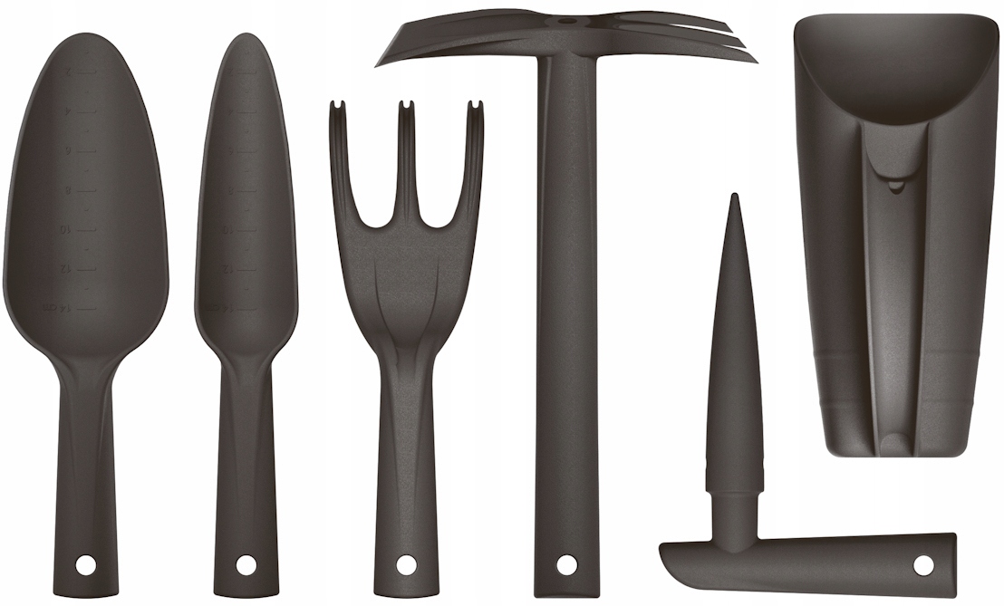 Zestaw 6 plastikowych narzędzi przeznaczonych do różnych prac ogrodowych.